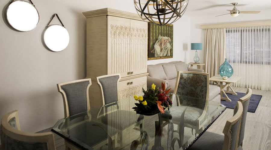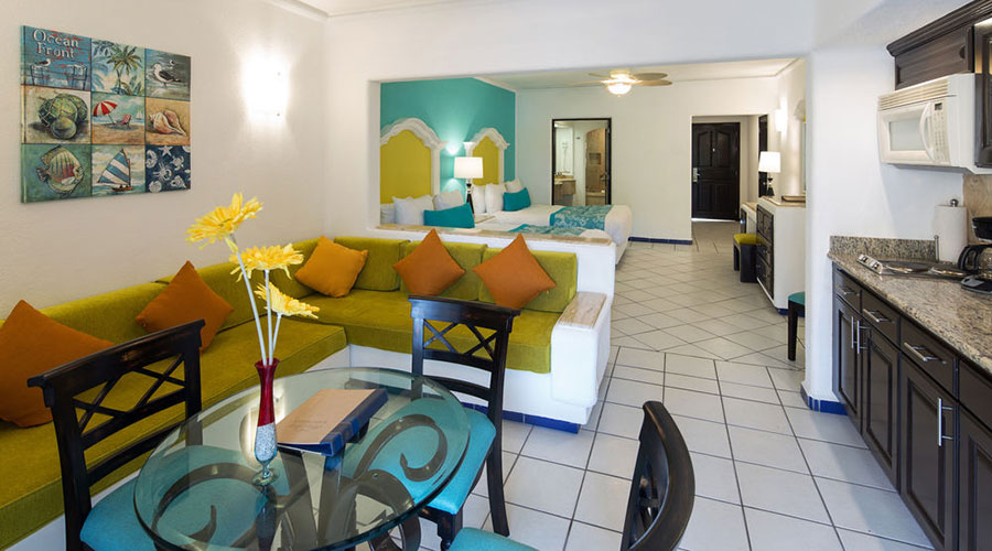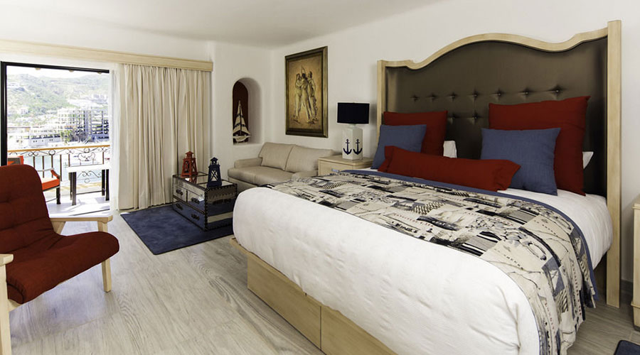 This nautical junior suite features one queen bed with sofa bed or two queen beds, sitting and dining area, kitchenette, a full bathroom and a balcony with marina or pool view. The Maximum capacity is up to 3 adults or 2 adults and 2 children. However you can purchase a 2nd room for a highly discounted rate if you need more room.